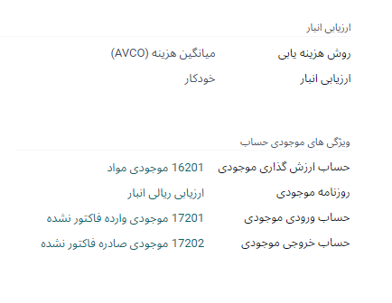 در شرایطی که سازمان از مکانیزم اتوماتیک ارزشگذاری انبار در اودوو استفاده کند میبایست بهازای هر گروه کالا (دستهبندی) حسابهای متناظر که در تراکنشهای مالی موردنیاز است را بهعنوان الگوی صدور اسناد در سیستم تعریف نماید.